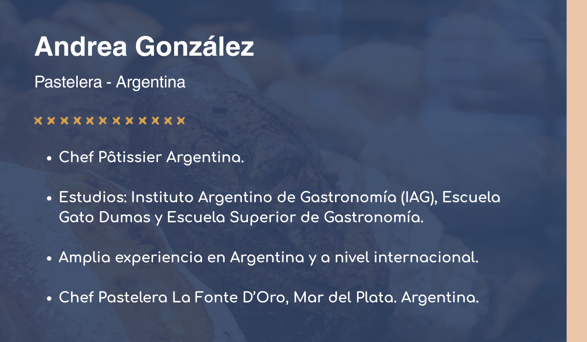 Chef pastelera y chocolatera con más de 40 años de trayectoria en Chile, Argentina y Europa.